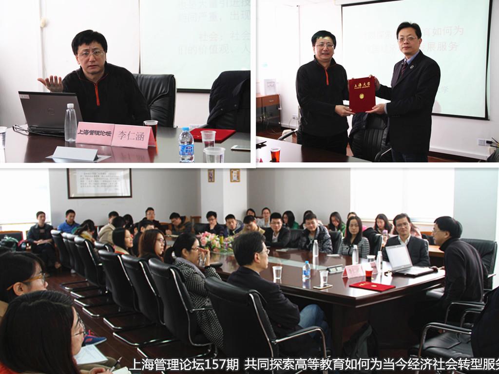 授证仪式后,李仁涵局长作为上海管理论坛第157期主讲人,与师生共同探索高等教育如何为当今经济社会转型服务。技术发展往往遵循一个可预期的模式,即萌芽—炒作—幻灭—技术成熟—稳步爬升—到达应用高峰。而遵循这一模式,学界研究认为当今世界城市发展已从二元空间进入了三元空间,即从人类决策与社会交往空间到计算机和互联网组成的信息空间。新技术革命的到来,人类社会将以更快的速度从“碎片化”走向“整体化”;“物质增量”走向“价值质量”;市场竞争模式由“恶性”走向不断学习,适应变化,创新发展,合作共赢的“理性竞争”。回顾过去30年,我国在取得世界瞩目成绩的同时,由于经济发展主要是拼资源、环境、土地与人力低成本,区域产品趋同严重,出现恶性竞争,社会发展严重滞后经济发展。我们要推动创新发展,推动新技术革命的到来,才能以一种健康的方式不断壮大当今经济,达到经济发展总目标。
