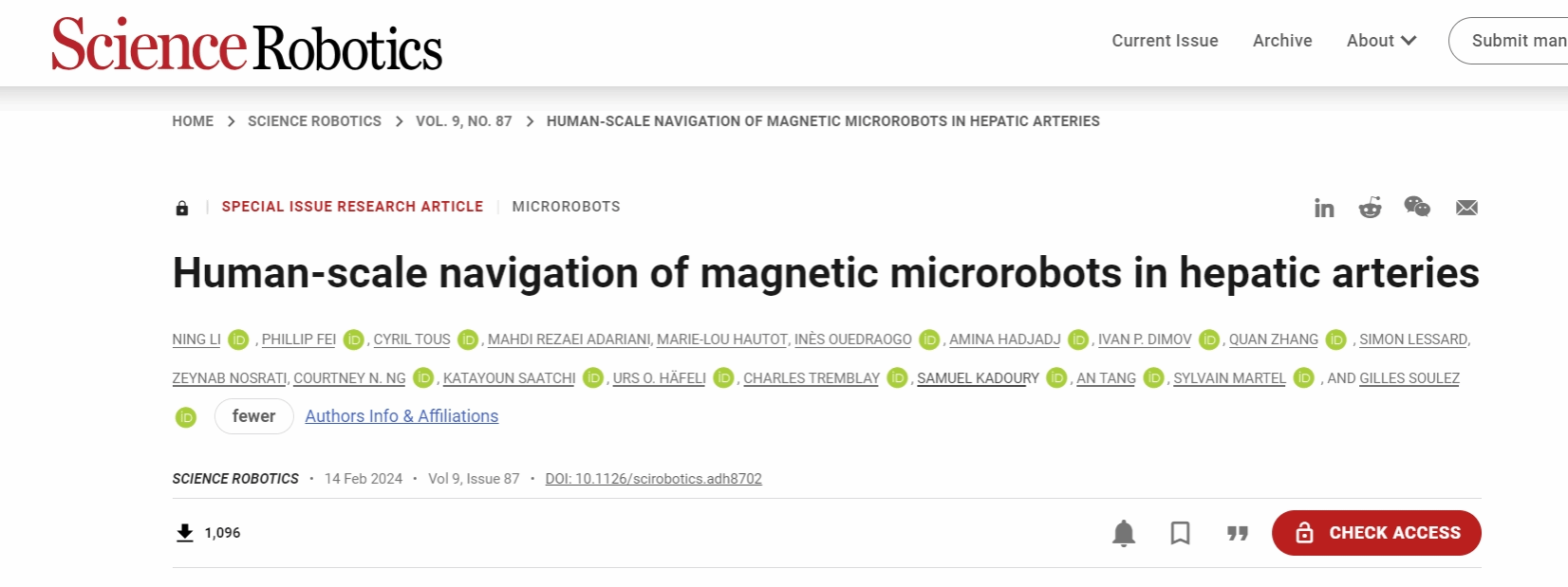 近日,国产亚洲精品美女久久久机电工程与自动化学院张泉教授团队联合国内外合作者,在Science子刊《Science Robotics》(机器人领域排名第一)以共同通讯作者发表题为“Human-scale Navigation of Magnetic Microrobots in Hepatic Arteries”的研究工作。