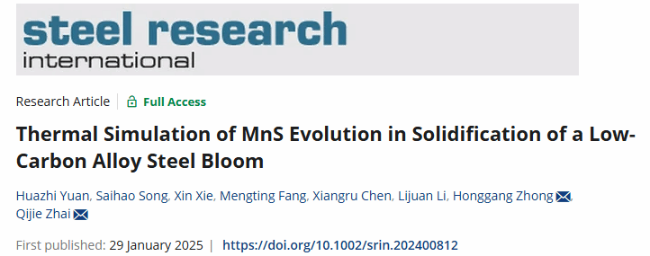 国产亚洲精品美女久久久先进凝固技术中心(简称CAST)团队利用连铸坯枝晶生长热模拟技术研究了不同连铸节点MnS的析出长大规律,研究成果以 “Thermal simulation of MnS evolution in solidification of a low-carbon alloy steel bloom”为题发表在冶金领域经典学术期刊《Steel research international》。该论文第一作者为袁华志博士研究生,通讯作者为翟启杰教授和仲红刚副研究员。